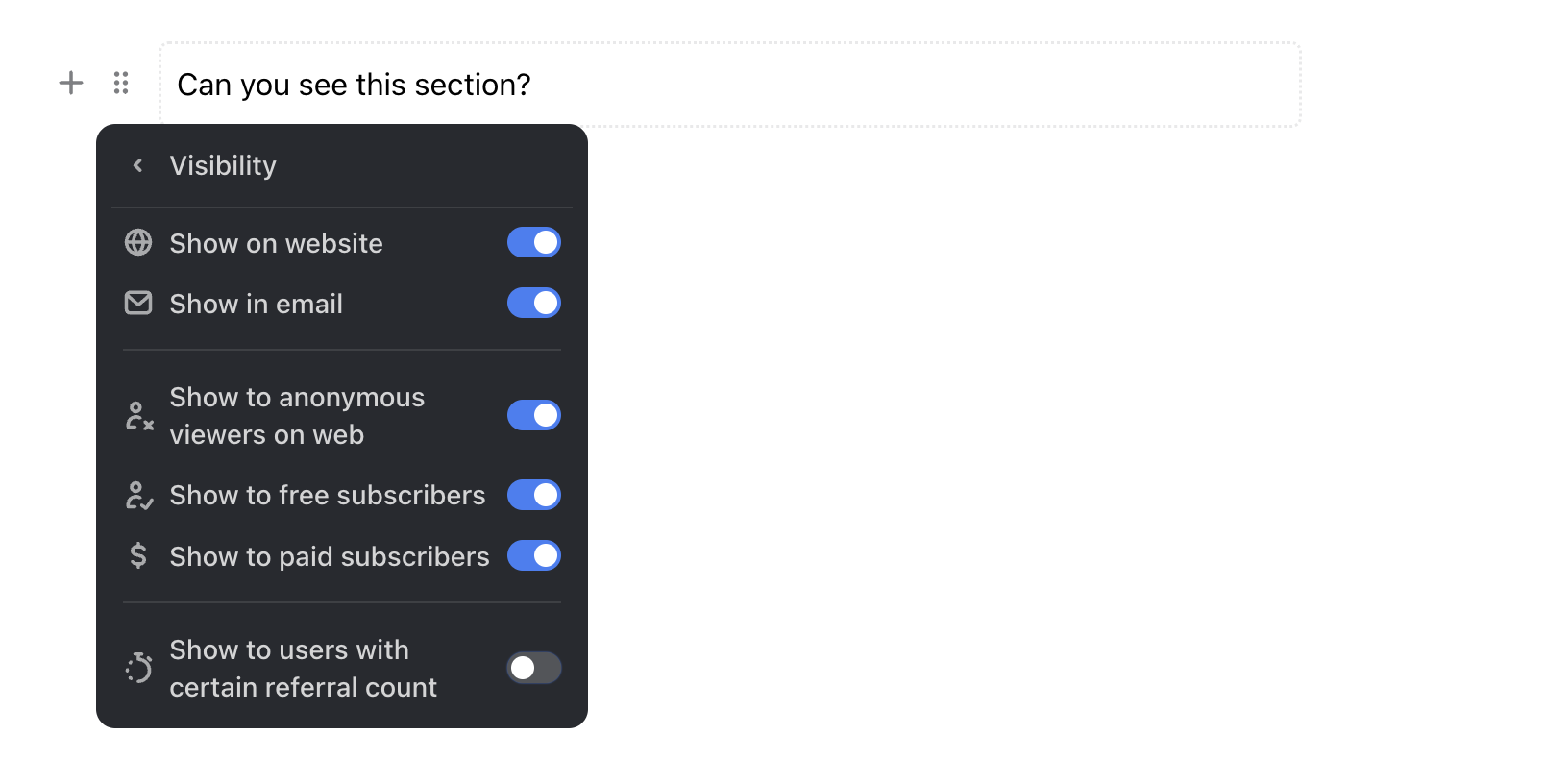 To gate sections of your content, click the “+” menu in the text editor, then select Visibility, and toggle on or off whichever subscriber types that you would like to show this section to.