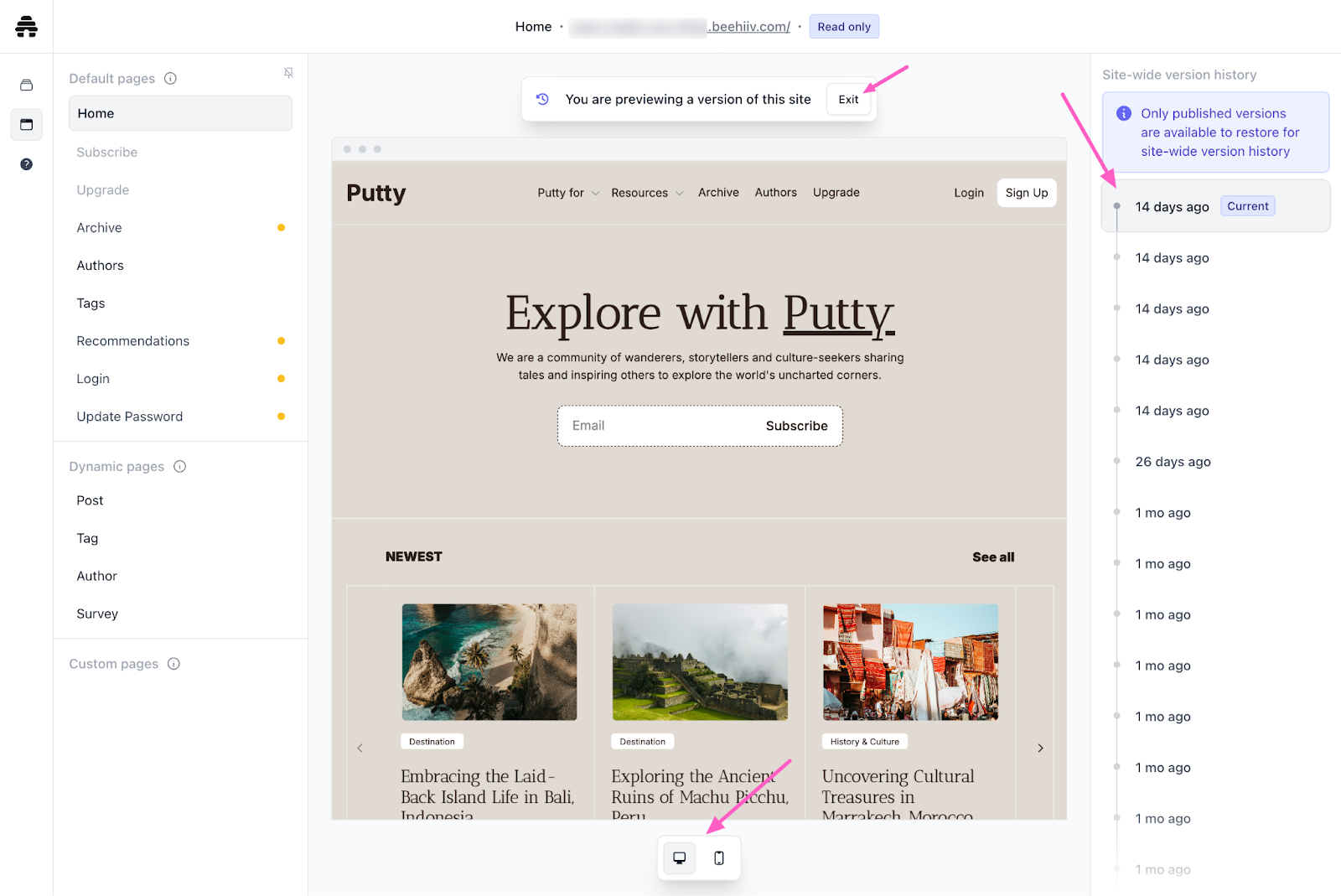 • A banner at the top indicates you’re in version history mode and lets you Exit back to the editor.
