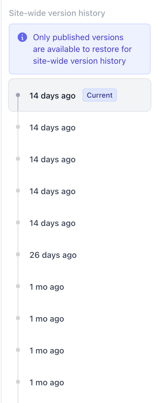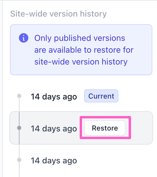This option is best for reverting changes across multiple pages at once. Just be aware that site-wide version history only includes published versions. Unpublished changes can be reverted at the page level.