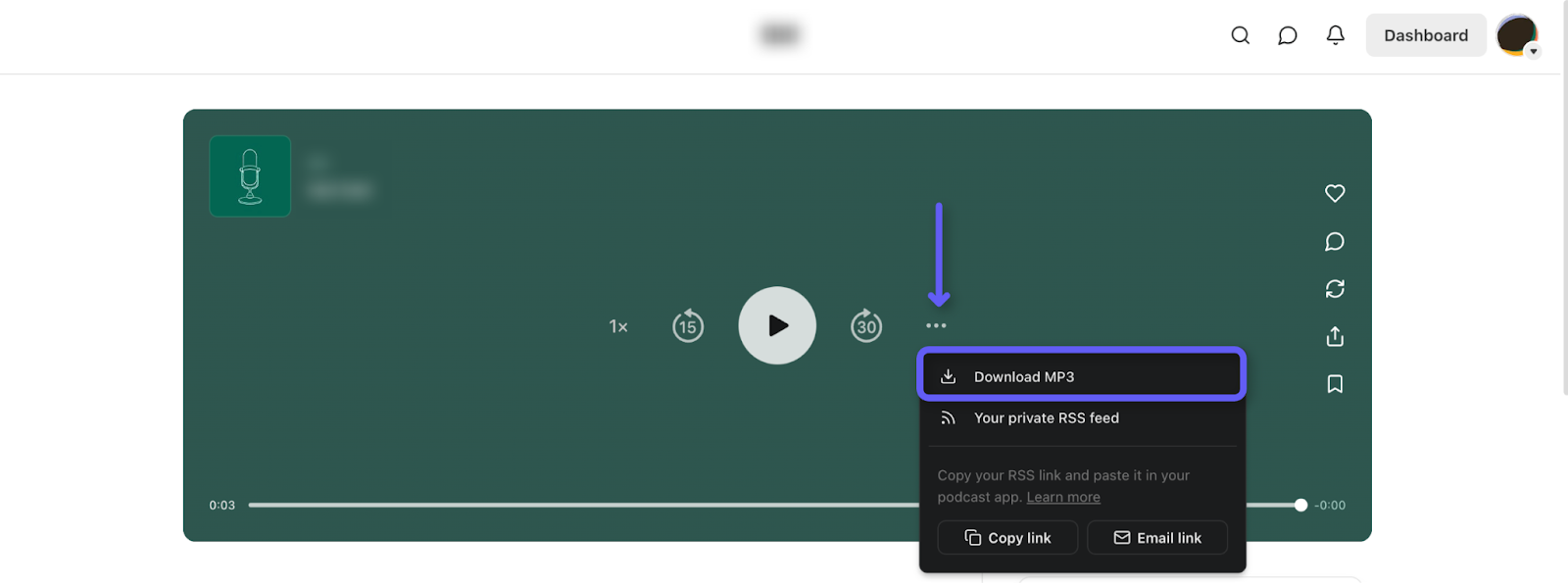 Download the audio file from Substack. Open the audio post in Substack. In the embedded player, click the 3 dots icon and select Download to save the audio file to your device.