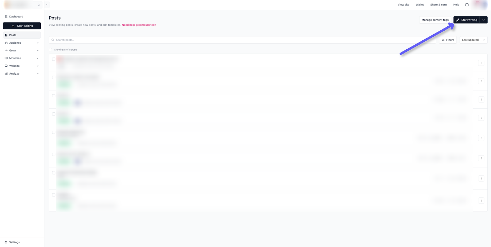 Create a new post. From your beehiiv account, go to Posts and click Start writing, or use the shortcut in the left panel.