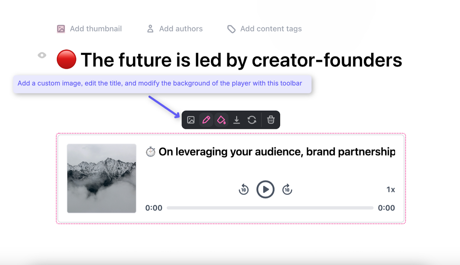 The Post Builder includes a native Audio block that lets you upload audio files directly into a post. This player supports common formats including: .mp3, .wav, .ogg, .flac, .aac, and .webm. Once added, it will display in the web version of your post and can be styled to match your podcast or brand.
