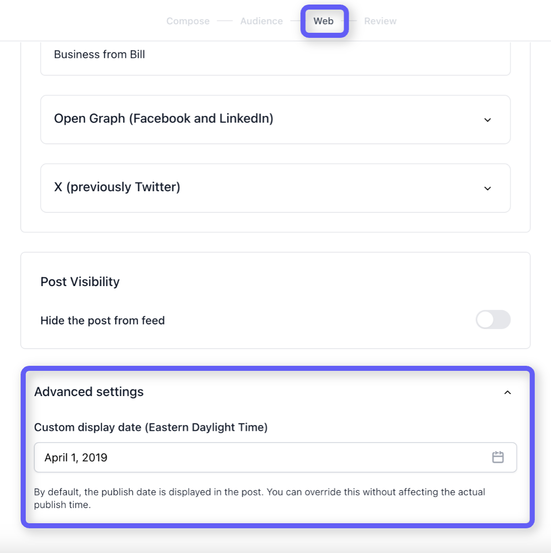 Backdate the post. Move over to the Web page of the Post Builder (up top). Scroll down to Advanced settings and click the calendar icon. Select the publish date that matches the original post publication date.