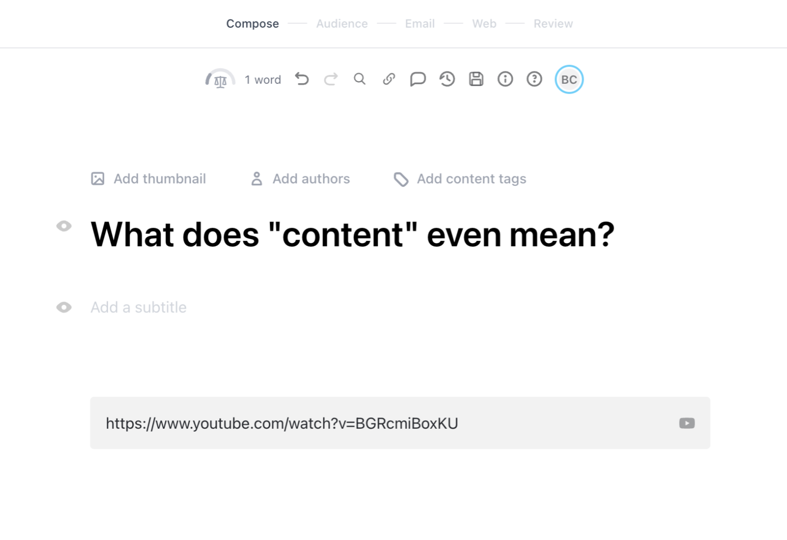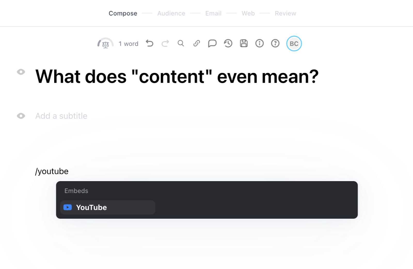 Add a YouTube block. The Post Builder will open on the Compose page. Type /youtube on the canvas to insert a YouTube block.