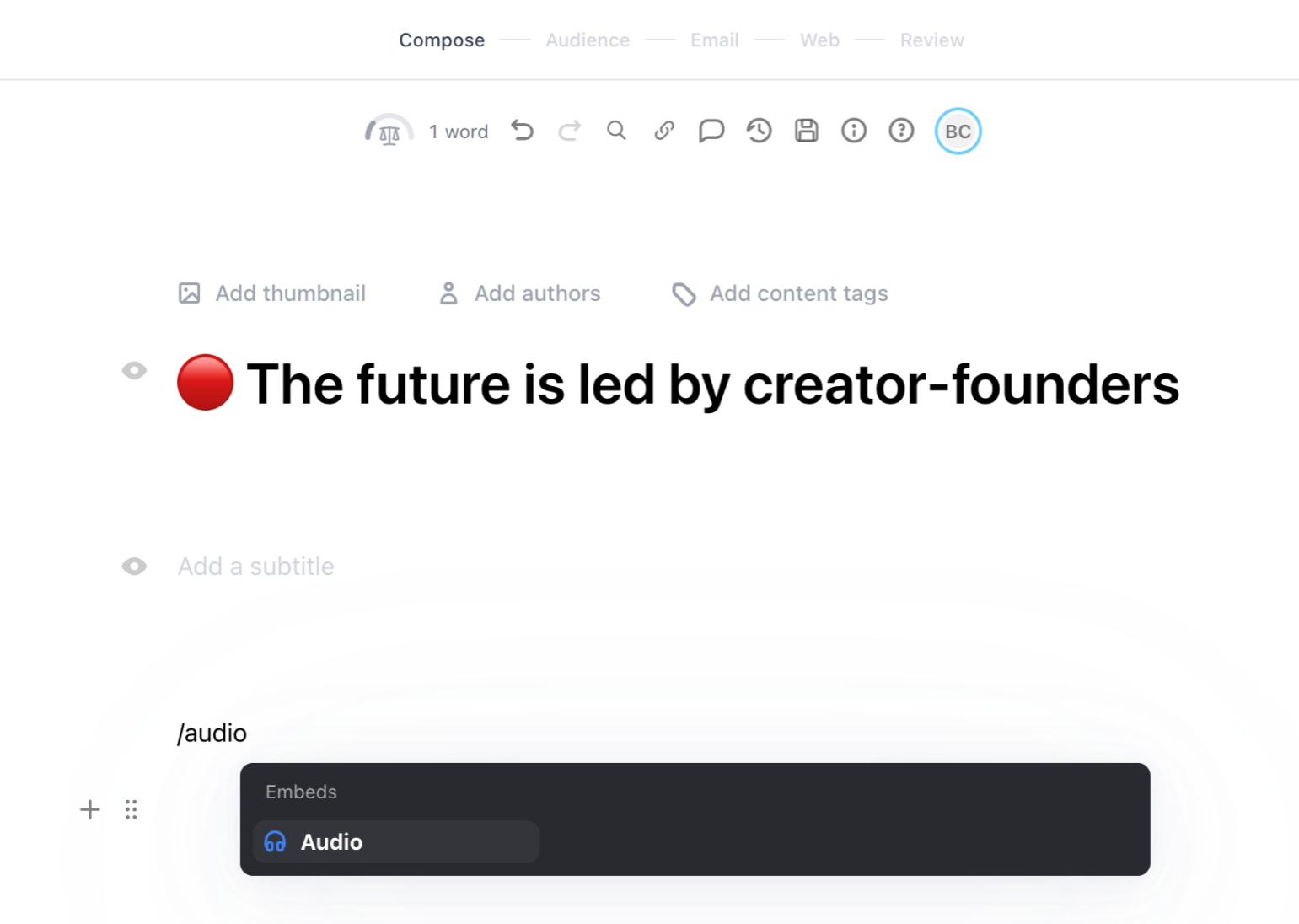 Add an Audio block. The Post Builder will open on the Compose page. Type /audio on the canvas to insert an Audio block.