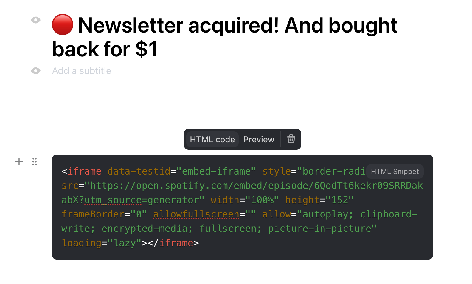 If your audio or video content is hosted on a third-party platform like Spotify, Vimeo, Apple Podcasts, or Transistor, you can embed it into your beehiiv post using an HTML Snippet block and the iframe HTML embed code the hosting platform provides.