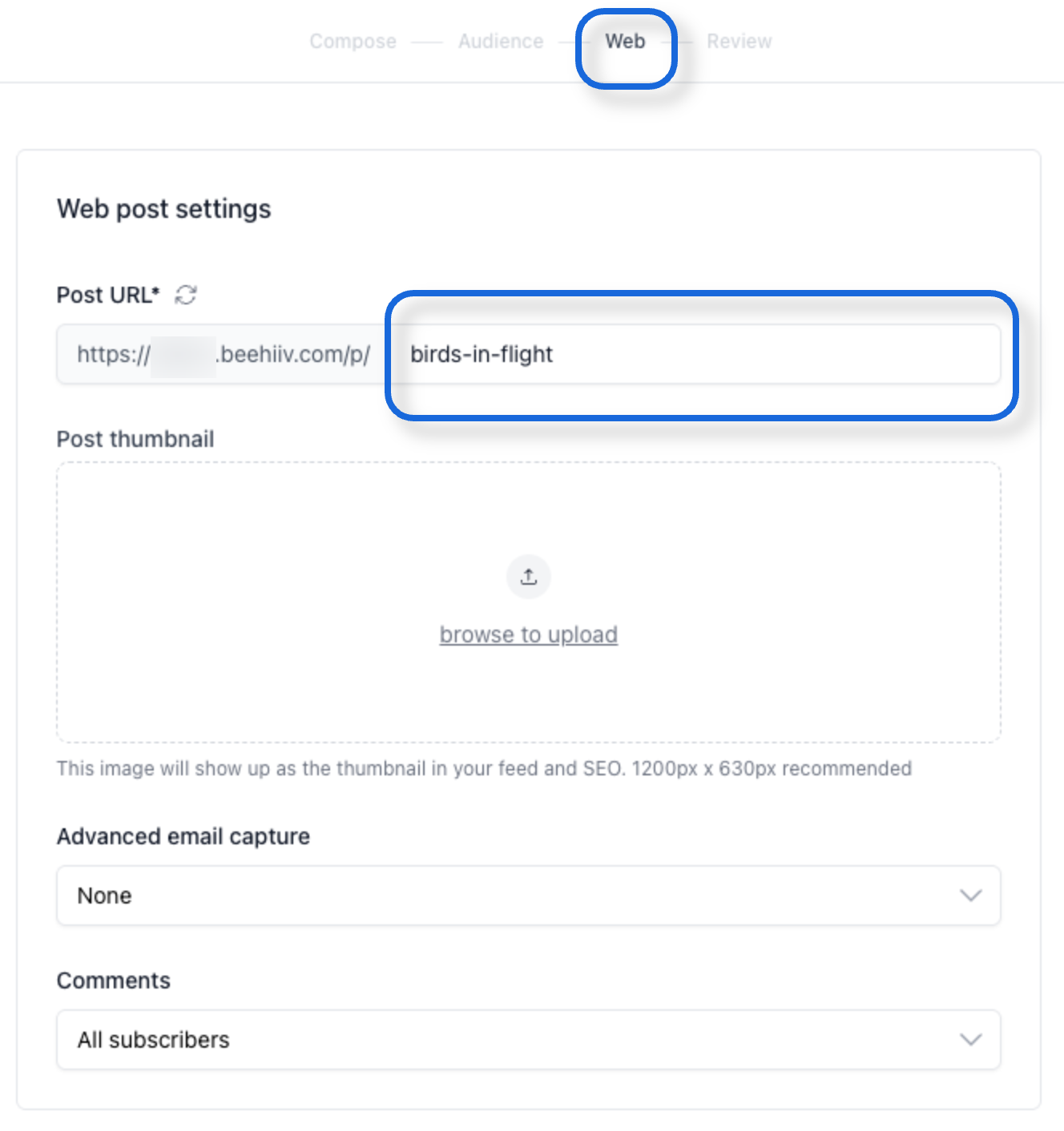 Edit the Post URL: If you previously used a custom domain on Substack and want existing backlinks to continue working after migration, edit the Post URL at the top of your Web post settings to match the original Substack post’s URL slug.